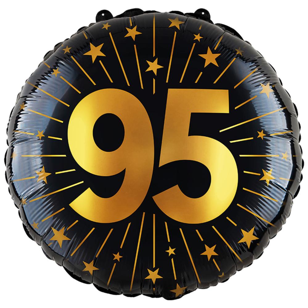 Folieballong med Stjärnor & Siffran 95 är en rund folieballong med strålande stjärnor och siffran "95" i guld mot svart bakgrund.