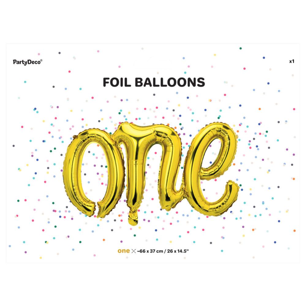 Folieballong One Guld omfattar en guldig folieballong i form av texten "One". Ballongen fylls med luft och är ca 66 cm bred och 37 cm hög.