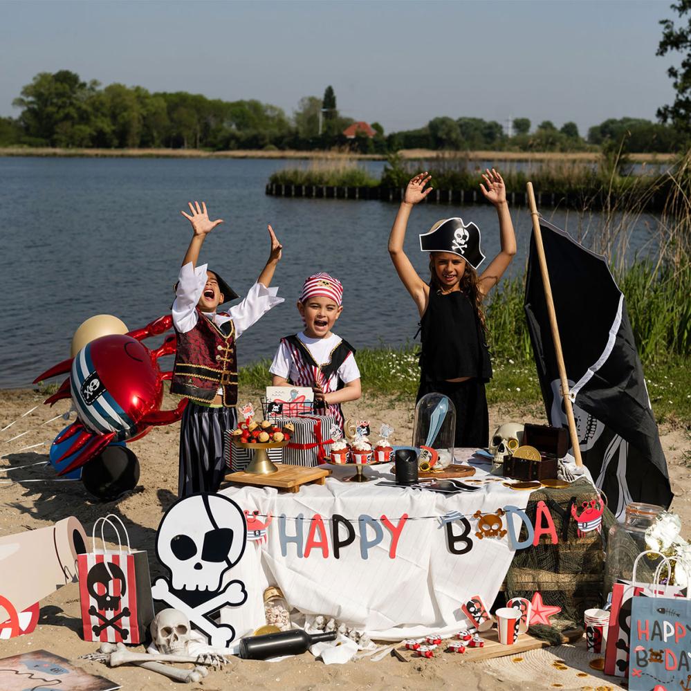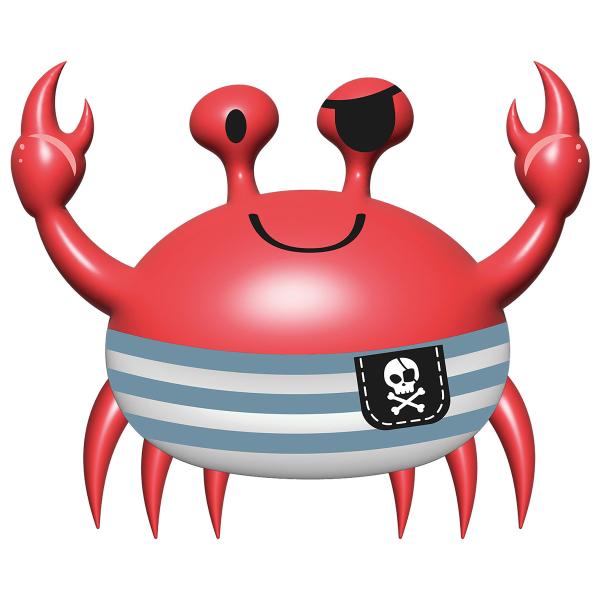Folieballong Piratkrabba 90 x 74 cm omfattar en folieballong i form av en krabba med temat pirater. Krabban är röd med blå och vita randiga piratbyxor med en dödskalle.
