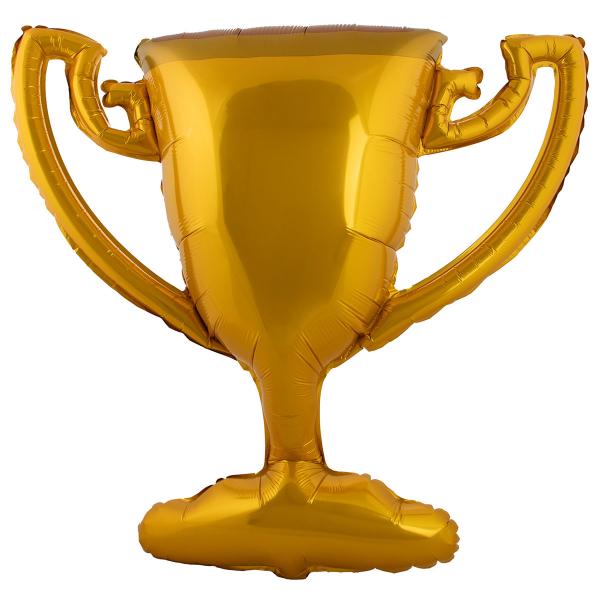 Folieballong Pokal 84 x 78 cm omfattar en guldfärgad folieballong i form av en pokal. Ballongen kan enkelt hängas upp med den medföljande upphängningsfliken.