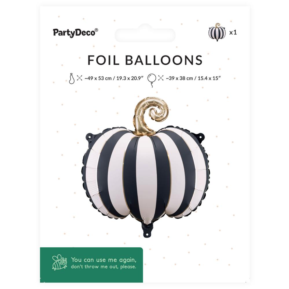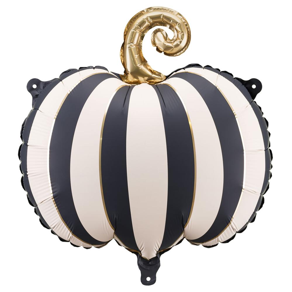 Folieballong Randig Pumpa Svartvit omfattar en folieballong i form av en randig pumpa i svart och vitt med en guldfärgad stjälk. Ballongen kan fyllas med luft med det medföljande blåsröret eller med helium.