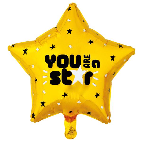 Folieballong Stjärna You Are A Star 46 cm omfattar en guldfärgad folieballong som är formad som en stjärna och har motiv av små vita och svarta stjärnor samt texten "YOU ARE a star" i svart där bokstaven a i ordet star är ersatt av en vit stjärna.