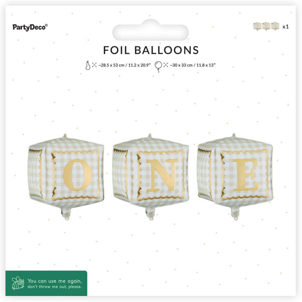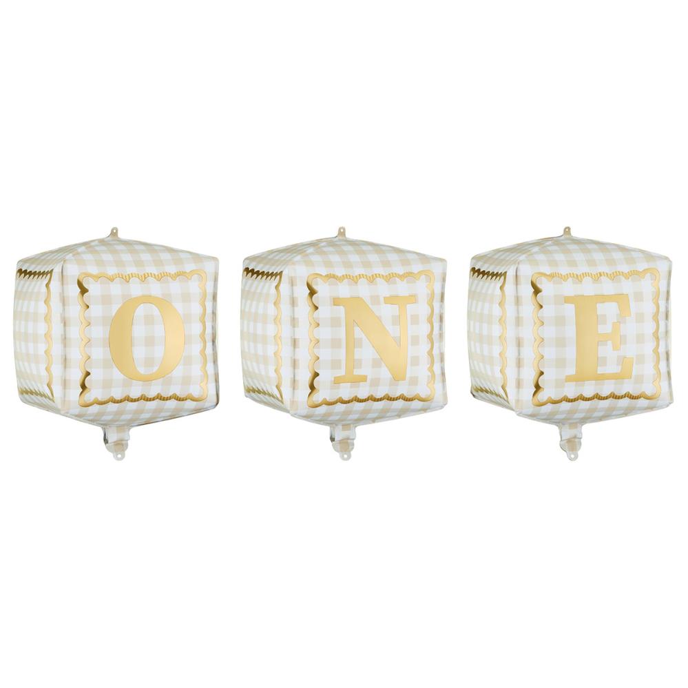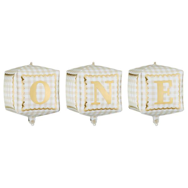 Folieballonger One Kuber 3-pack omfattar ett set som innehåller tre kubformade ballonger i krämfärg med ett rutigt mönster och gulddetaljer. Varje ballong är dekorerad med en stor guldfärgad bokstav och tillsammans bildar ballongerna ordet 'ONE' när de placeras bredvid varandra. De kan fyllas med luft eller helium och levereras med ett sugrör för uppblåsning.