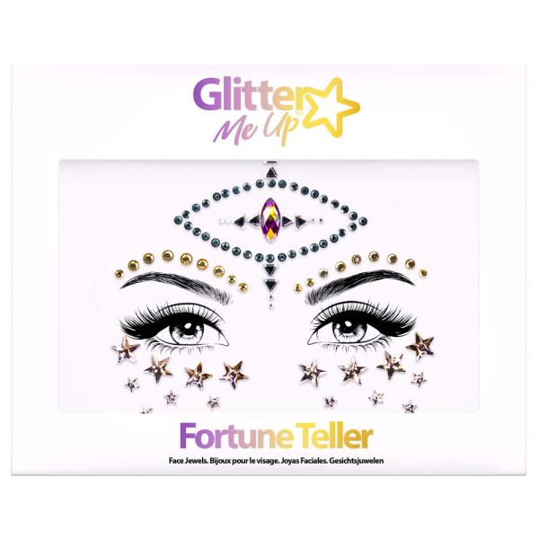 Fortune Teller Ansiktssmycken omfattar fem stycken skimrande ansiktssmycken i silver, blått och rosa. Diamanterna sitter på genomskinliga stickers med självhäftande baksida. Applicera ansiktssmycket genom att försiktigt dra av hela stickern från plasten och tryck det mot ren och torr hud i ca fem sekunder.