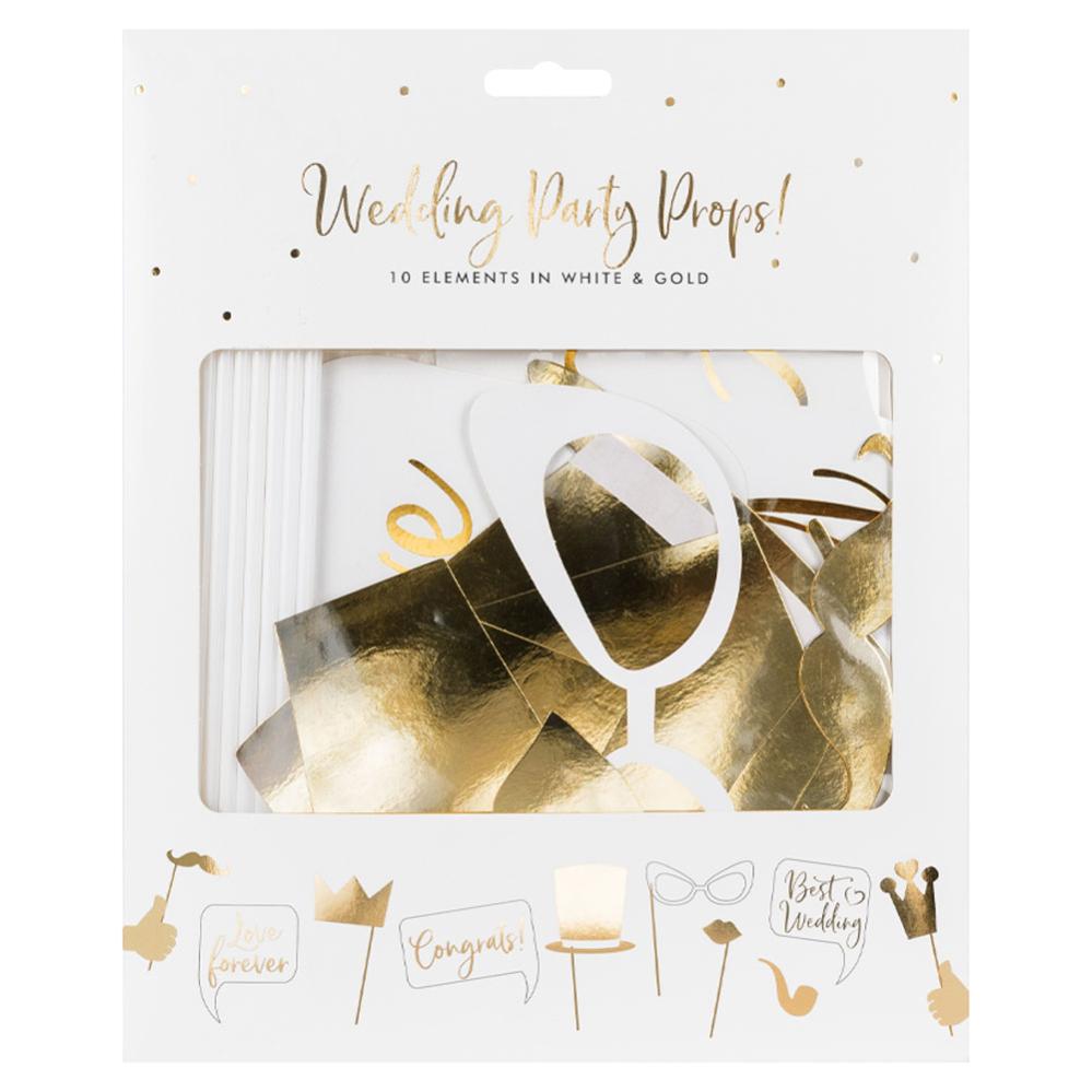 Foto Props Bröllop Guld omfattar 10 stycken bröllops-fotoprops i vitt och guld. Fotorekvisitan är i form av två olika kronor, en hatt, en pipa, en pussmun samt skyltar med texterna "Love Forever", "Best Wedding" och "Congrats!". Kommer med långa träpinnar.