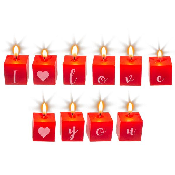 Fyrkantiga Ljus I Love You består av ett set med totalt tio röda, dekorativa fyrkantiga ljus. Ljusen är prydda med inskriptionen "I love you" i rosa, där varje bokstav finns på ett eget ljus. Dessutom ingår två ljus med motiv av ett rosa hjärta.