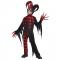 Galen Gycklare Dräkt Barn är en svart maskeraddräkt med ett svart/rött rutmönster och omfattar tröja, byxor, handskar och en kåpa med fastsatt huvudbonad med bjällror, samt en läskig mask färgad halvt grå och halvt röd som täcker framsidan av huvudet.