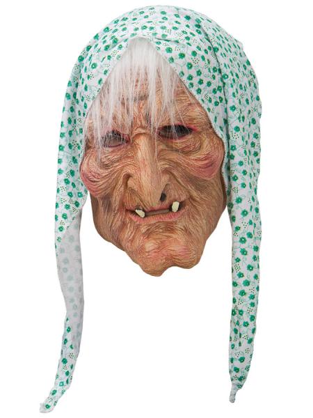 Gammal Tant Mask är tillverkad av latexmaterial och omfattar en mask föreställande en gammal tant med grönfärgad scarf, grått hår och en massa rynkor. Masken är i fullstorlek och går runt hela huvudet.