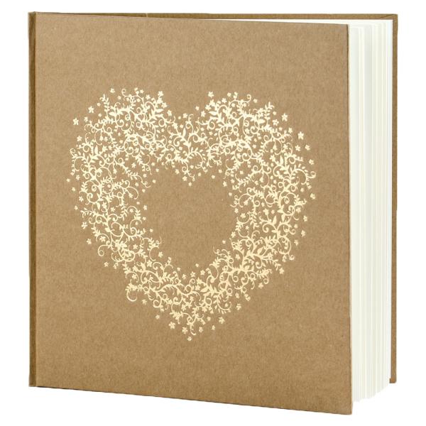 Gästbok med Hjärta omfattar en brun gästbok med guldigt hjärta på framsidan. Boken är ca 20,5 x 20,5 cm stor och har 22 st blanka sidor.