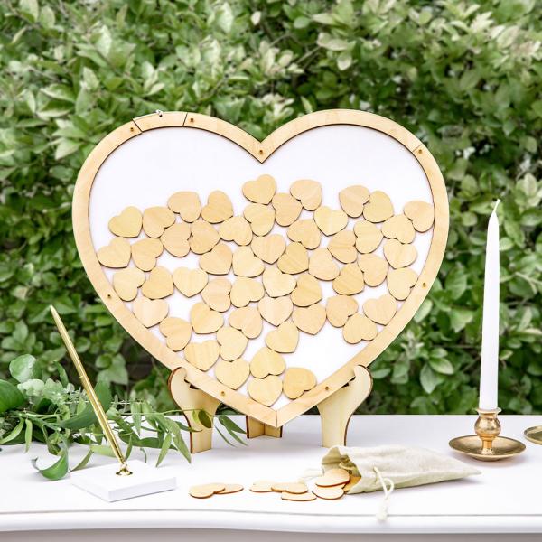 En dekorativ gästbok i form av en hjärtformad ram av ljust trä. Gästboken kommer även med små söta trähjärtan som gästerna kan skriva en liten hälsning på och sedan lägga ner i ramen. Det blir både en fin dekoration till firandet och ett roligt minne att spara. Riktigt fin gästbok som passar superbra till förslagsvis bröllop, dop och baby shower.