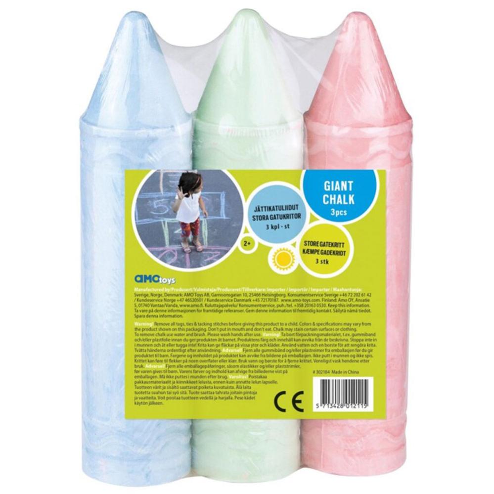 Gatukritor Stora 3-pack innehåller tre stycken kritor i olika färger. Gatukritorna är ca 10 cm långa och 2,5 cm breda.