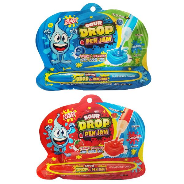Gelégodis & Penna med Gel 55g är en penna med sur gel på 15 gram som appliceras på de medföljande gelégodisarna på 40 gram med jordgubbs- eller blåbärssmak.