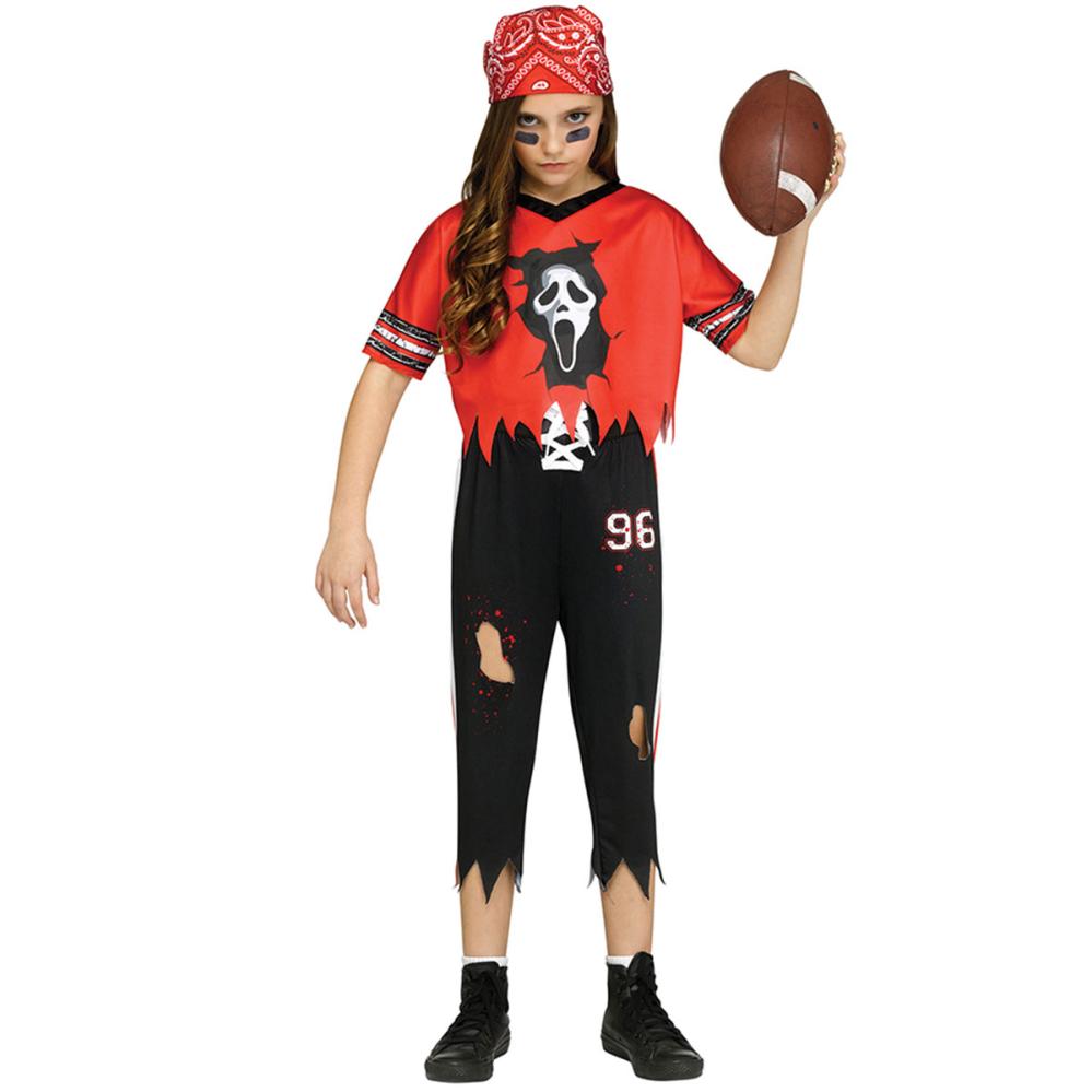 Ghostface Skräckspelare Maskeraddräkt Barn omfattar en röd fotbollströja med Ghostface-motiv och taggiga kanter, svarta byxor med matchande taggiga nederkanter, revor och blodfläckar, samt en röd bandana med klassiskt paisleymönster i vitt och svart.