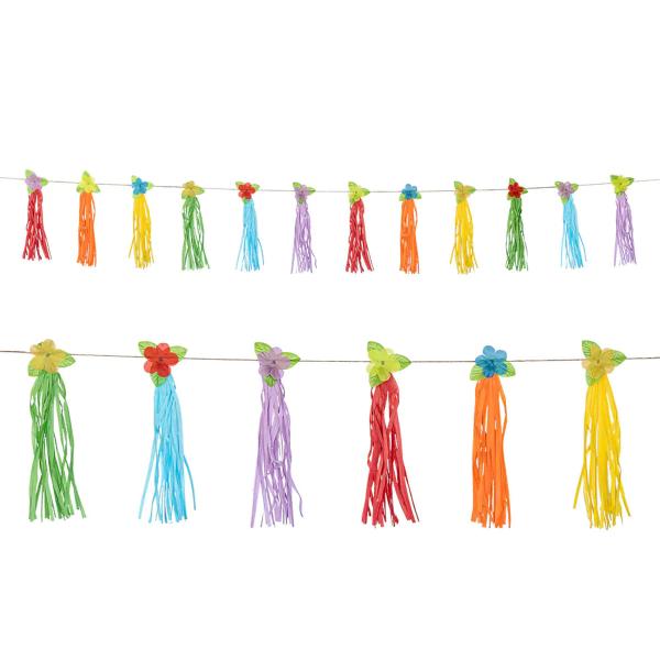 Girlang med Tofsar Hawaii 3 m omfattar en girlang med tolv tofsar med varsin blomma i grönt, blått, lila, rött, orange och gult. Girlangen hänger på ett beige repsnöre.