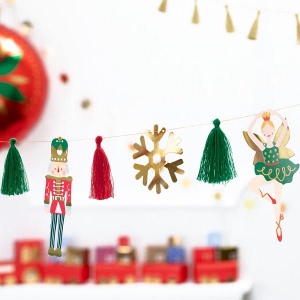 Girlang Nutcracker DIY omfattar en DIY girlang med guldigt snöre, 6 st gröna och röda tofsar samt 7 st, ensidiga pappmotiv i form av nötknäppare, ballerinor och snöflingor. Trä på motiven på snöret och häng upp den mot väggen. Girlangen blir ca 16,5 cm hög och 1,7 meter lång.