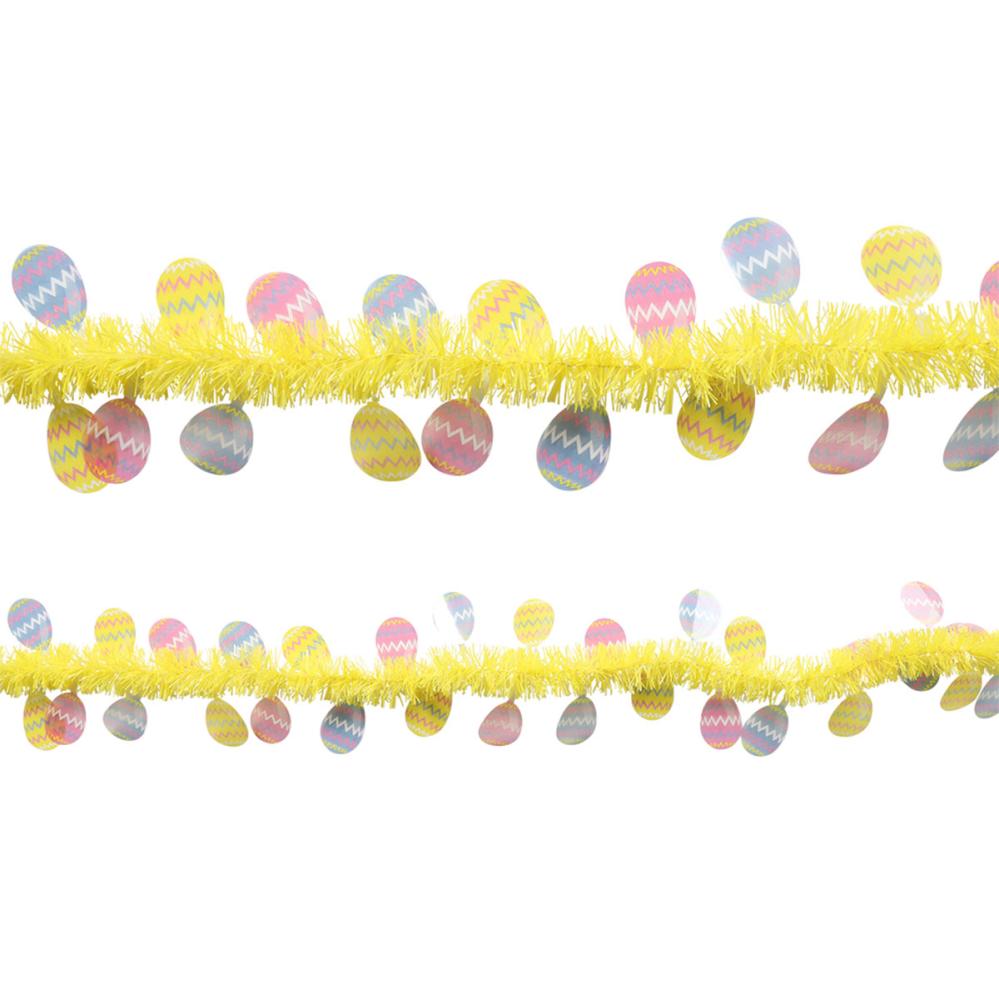 Girlang Påsk 2 m omfattar en gul påskgirlang som är dekorerad med äggdetaljer i olika färger. Genom girlangen löper även en tunn metalltråd som gör den enkel att forma precis som du vill.