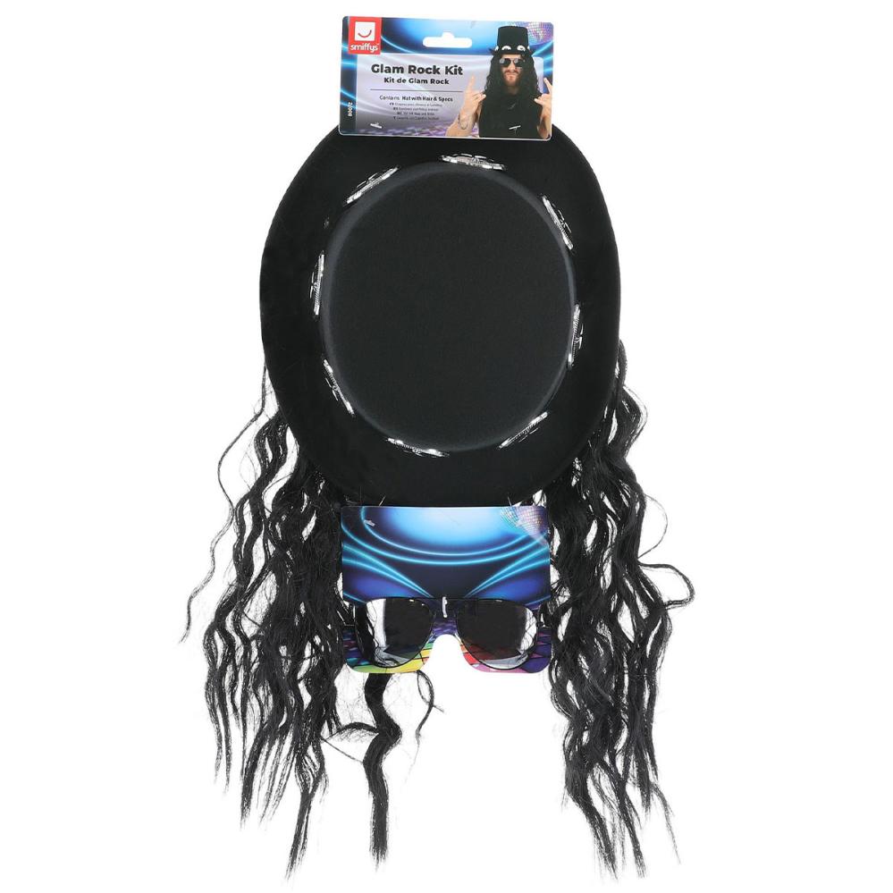 Glamrock Hatt med Hår & Glasögon omfattar en svart höghatt med silvriga dekorationer kring bandet samt fastsittande långt, vågigt hår. Det medföljer även ett par svarta retroglasögon med spegellinser. Observera att glasögonen ej är UV-skyddade!