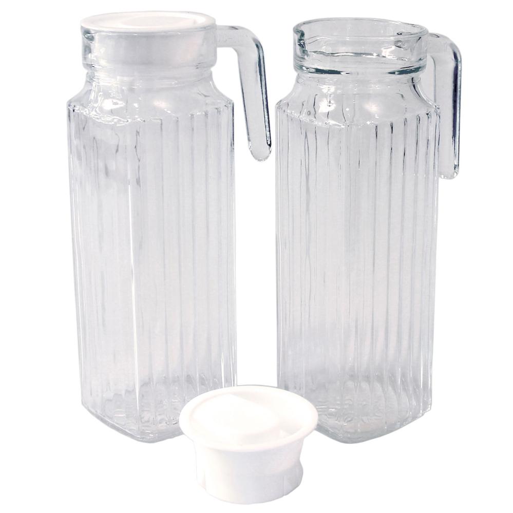 Glaskanna med Lock 1 Liter består av en glaskanna med handtag och plastlock, och den fyrkantiga formen gör kannan idealisk för förvaring i kylskåpsdörren.