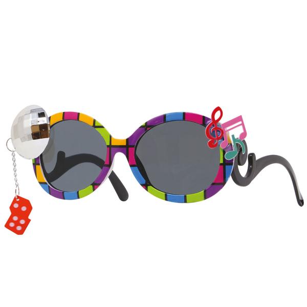 Glasögon Disco omfattar ett par färgglada glasögon med mörka linser. Glasögonen har tre musiknoter på ena sidan och en discokula med tärningar hängandes i en kedja på andra sidan.