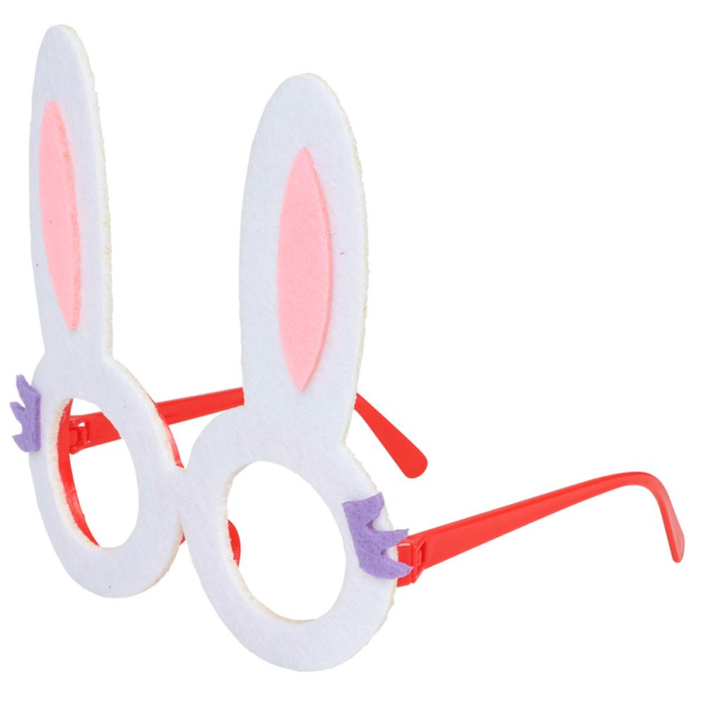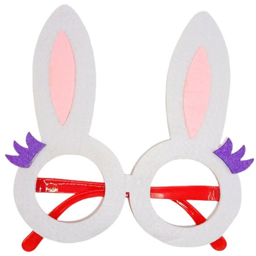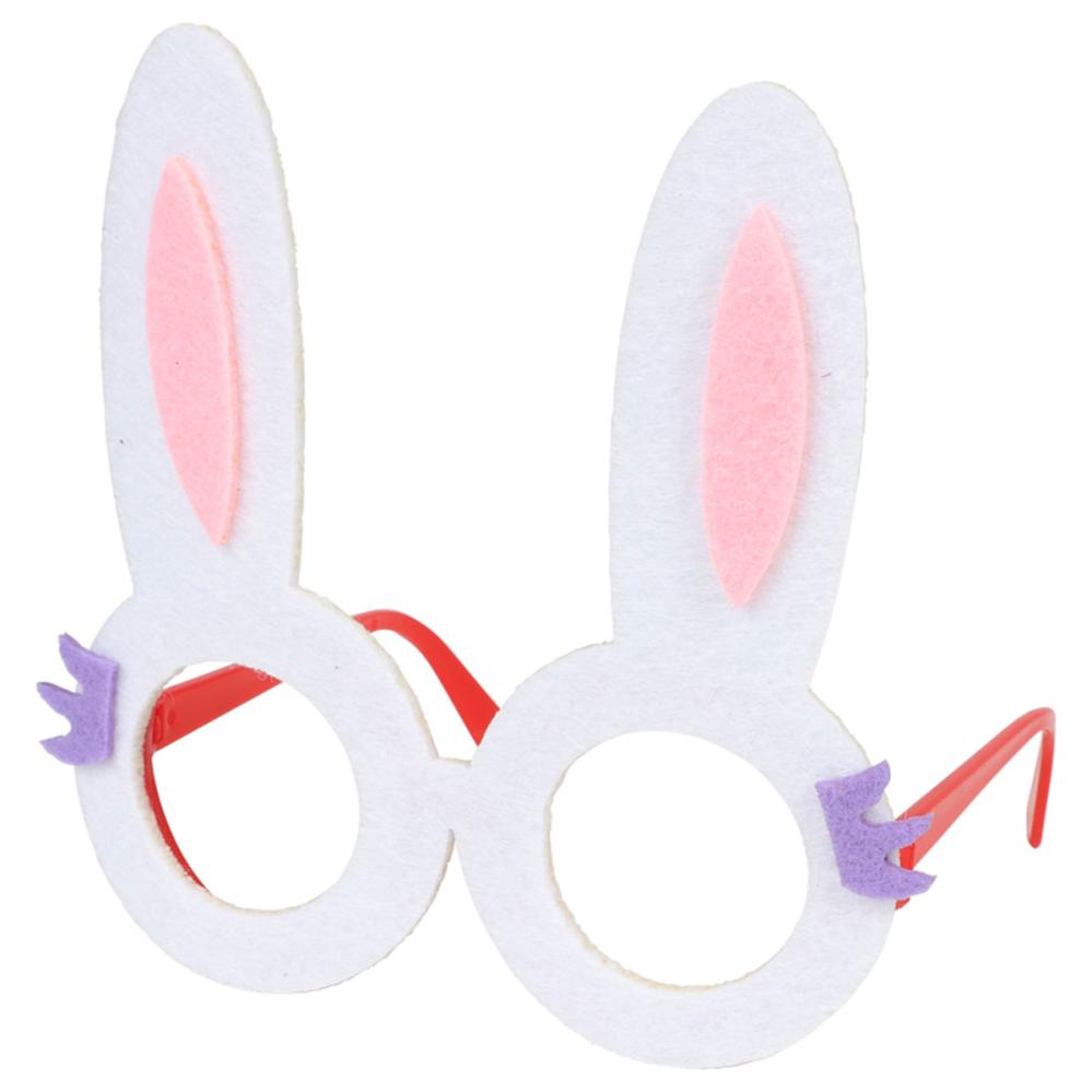 Glasögon Kaninöron 14x15 cm är ett par glasögon utan linser med en röd båge i plast och fastsatt filttyg med uppstickande kaninöron i vitt, rosa och lila.
