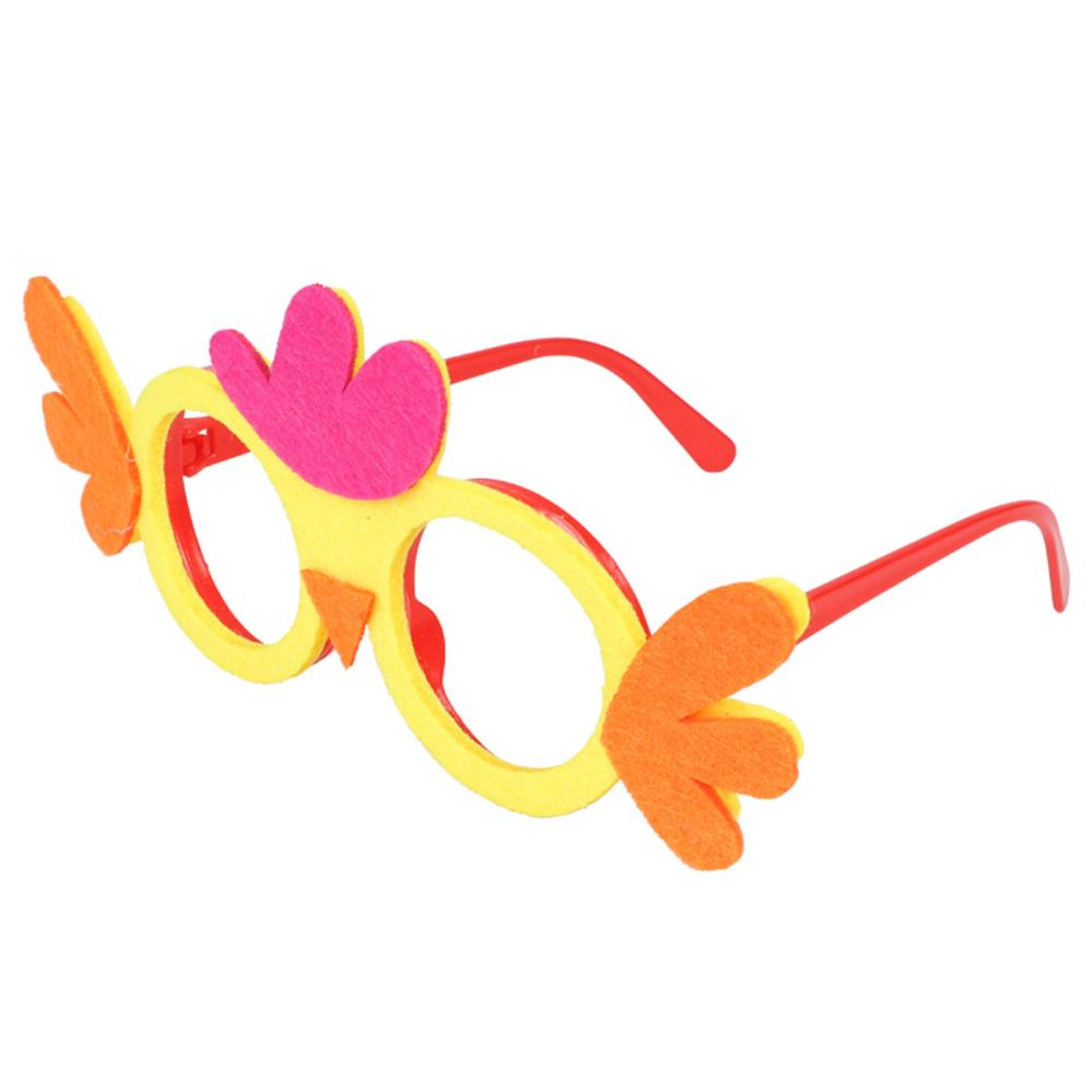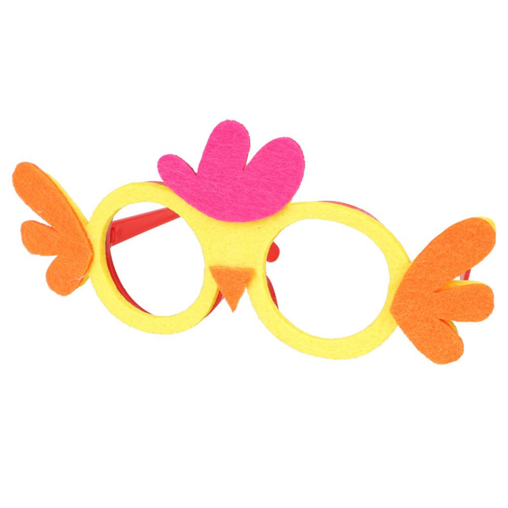 Glasögon Kyckling 18x8 cm är ett par glasögon utan linser med en röd båge i plast med fastsatt filttyg framtill i form av en kyckling i gult, violett och orange.