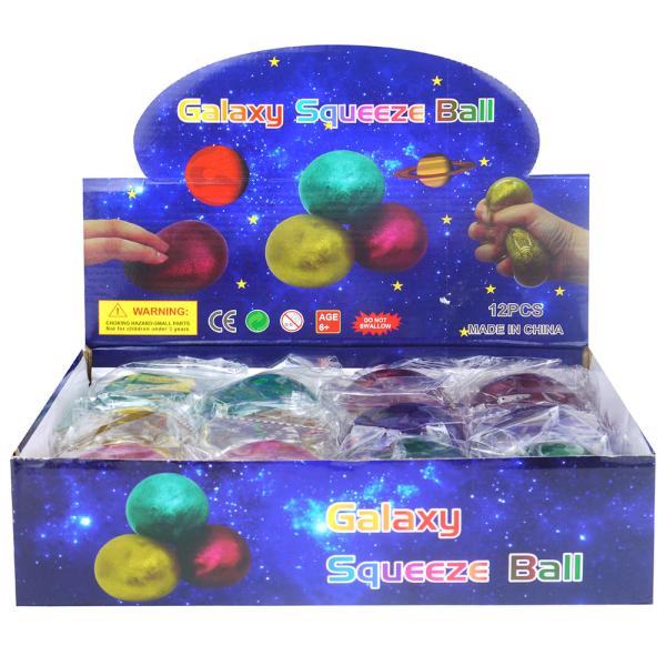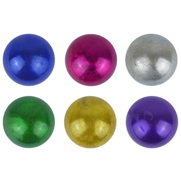 Glittrig Klämboll omfattar en mjuk stressboll med en glittrig yta. Bollen finns i färgerna blå, lila, guld, silver, grön och röd men den säljs osorterad och styckvis så det blir en överraskning om vilken färg du får.