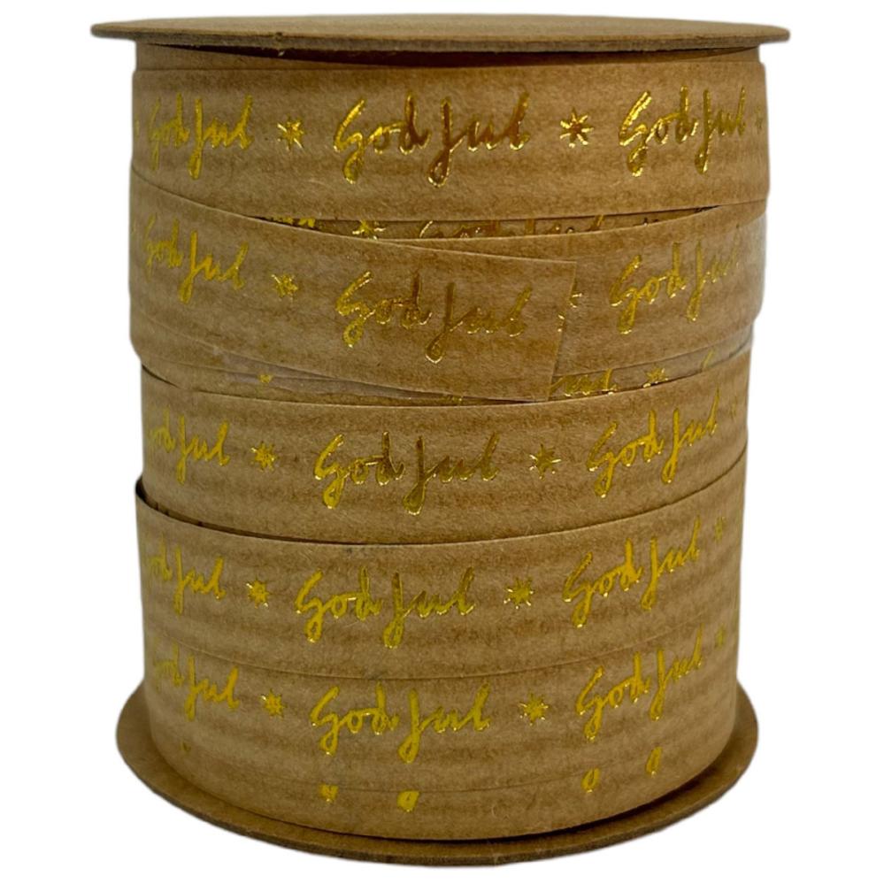 God Jul Presentsnöre 10 m är ett beige presentsnöre med texten "God Jul" i skimrande guldfärg.