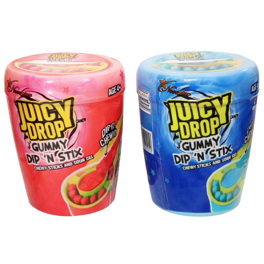 Godispinnar med Sur Gel 96 g är godispinnar med sur gel att doppa i, förpackade i en 96-grams plastburk i blått eller rött.