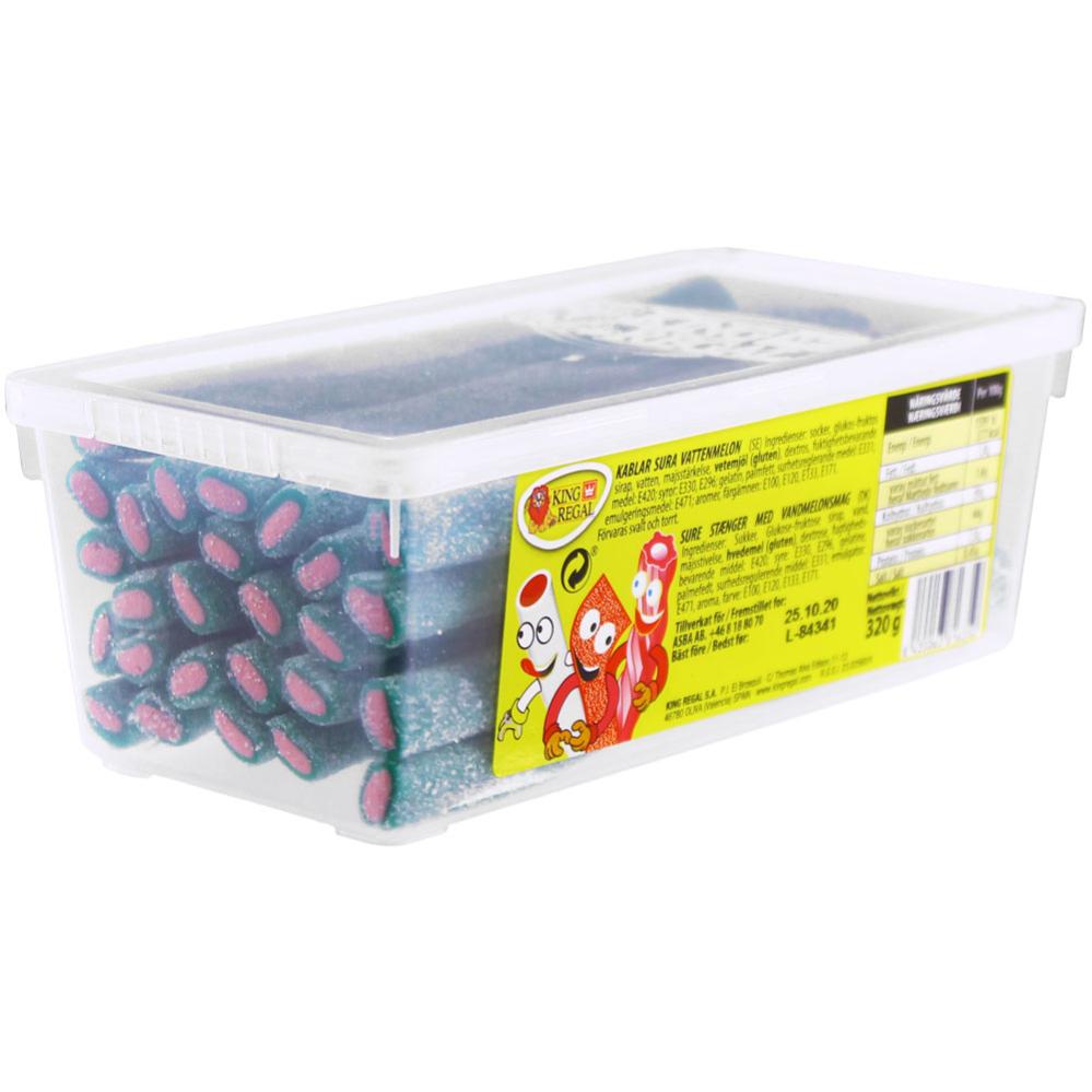 Kablar Sur Vattenmelon 20st omfattar en plastlåda med godis kablar med smak av sur vattenmelon.