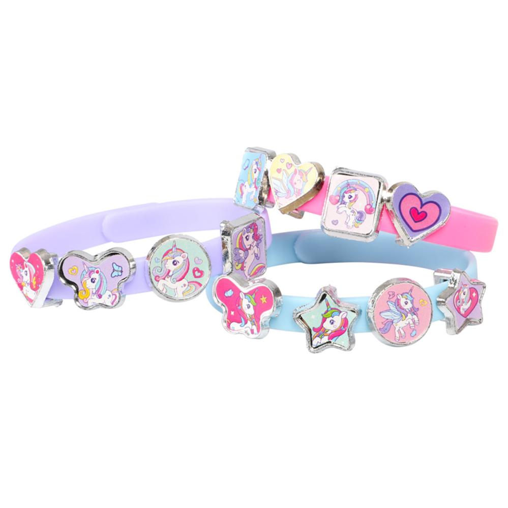 Gör Egna Enhörnings Armband Set omfattar ett set med tre stycken armband i blått, lila och rosa samt 18 stycken berlocker med motiv av enhörningar, stjärnor, hjärtan och fjärilar.