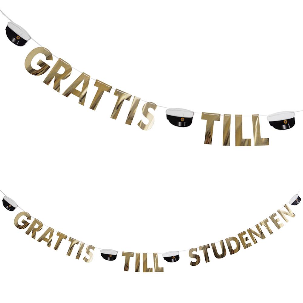 Grattis Till Studenten Girlang 4 Meter innehåller en 4 meter lång girlang med motiv av studentmössor och en stor guldfärgad text som säger "GRATTIS TILL STUDENTEN".