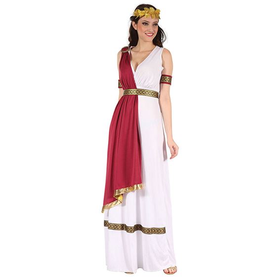 Grekisk gudinna budget maskeraddräkt Innehåller en vit lång toga klänning samt gulddetaljer med matchande bälte och ett par armband. Toga klänningen kommer med en fastsydd röd kappa och ett mönstrat gyllene spänne, sist ingår även ett pannband av guldlöv. Finns endast i vuxenstorlek.