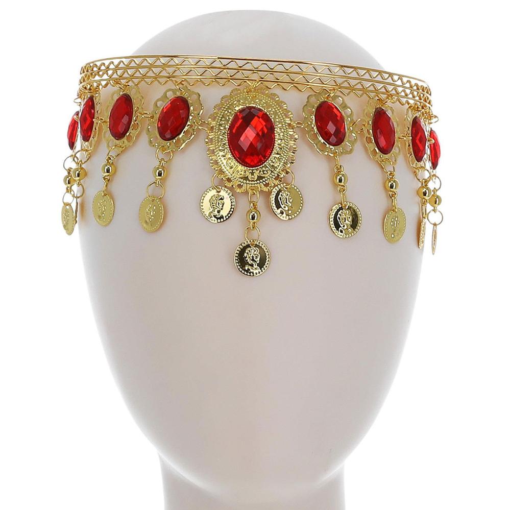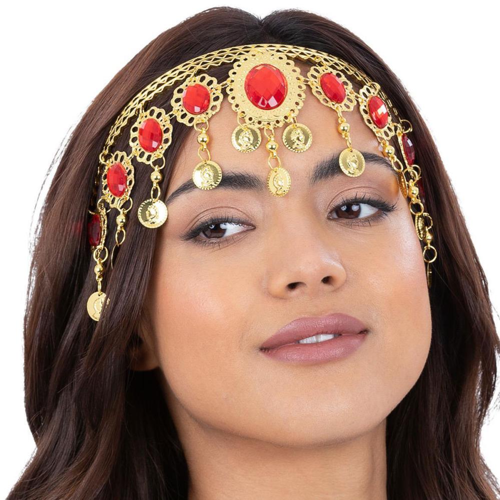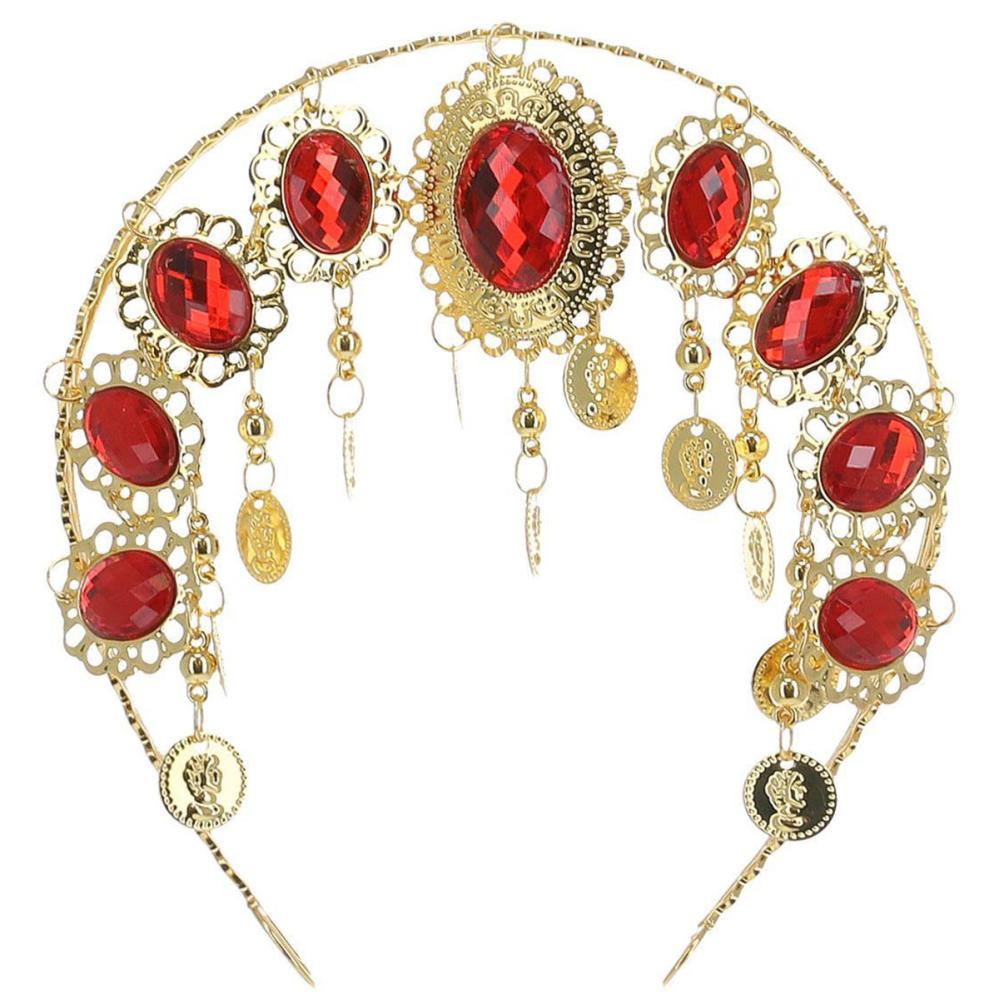 Grekisk Hårprydnad med Rubiner omfattar ett guldfärgat pannband i en stil inspirerad av antikens Grekland som pryds av hängande röda rubiner och små mynt.