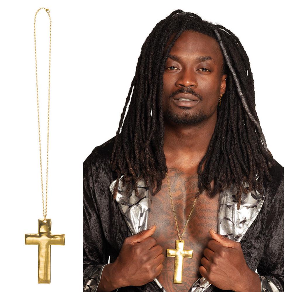Med detta halsband med fint kors i skimrande guld runt halsen kan du antingen se riktigt kyrklig ut eller se riktigt förmögen ut, allt beror på ditt klädval. Bär halsbandet till en lång svart dräkt och se ut som en religiös präst eller bär det tillsammans med en exklusiv kappa för att se ut som en rik pimp. Ett mångsidigt kors halsband som funkar alldeles utmärkt till flera olika maskerad och Halloween utklädnader.