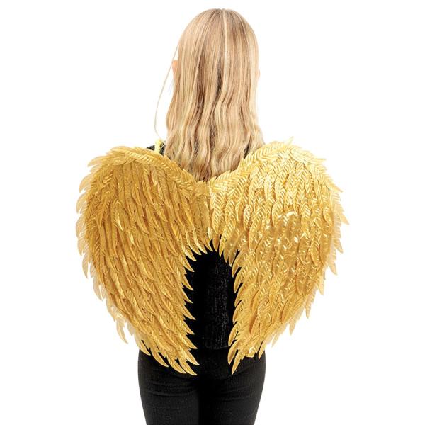Guldiga Vingar med Fejk Fjädrar omfattar ett par guldfärgade vingar med fjädrar i polyester. Vingarna fästs på ryggen med hjälp av elastiska band som träs runt armarna.
