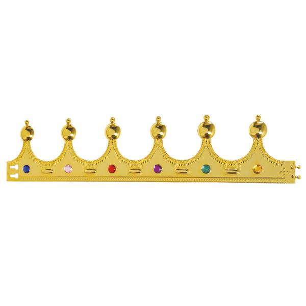 Guldkrona Barn omfattar en vacker guldkrona för en kung eller drottning, perfekt för att fira en födelsedag eller en karnevalsfest. Kronan har färgglada ädelstenar på sidan och dekorativa kanter.
