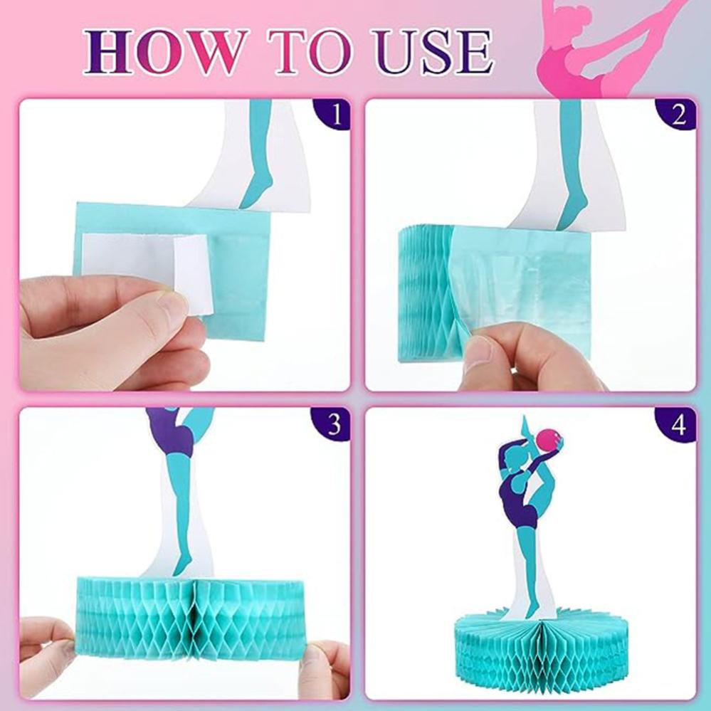 Gymnastics Bordsdekoration är en bordsdekoration med motiv av en gymnast, stjärnor och bom i rosa/lila mot en turkos bakgrund ovanpå en rosa platform.