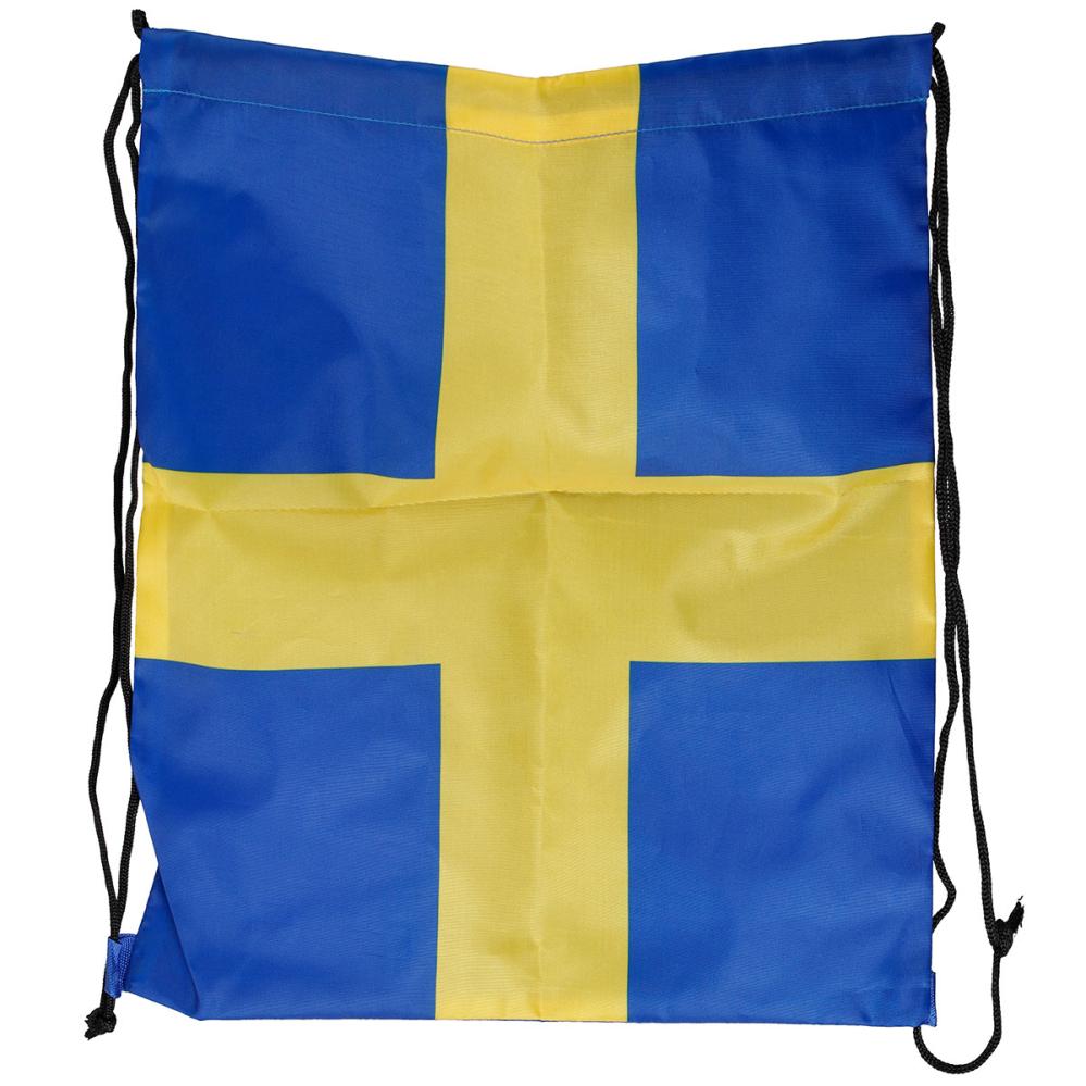 Gympapåse Sverige 39 x 33 cm omfattar en blå och gul gymnastikpåse med motiv av den svenska flaggan. De två blå axelsnörena fungerar både som bärremmar och för smidig öppning och stängning.