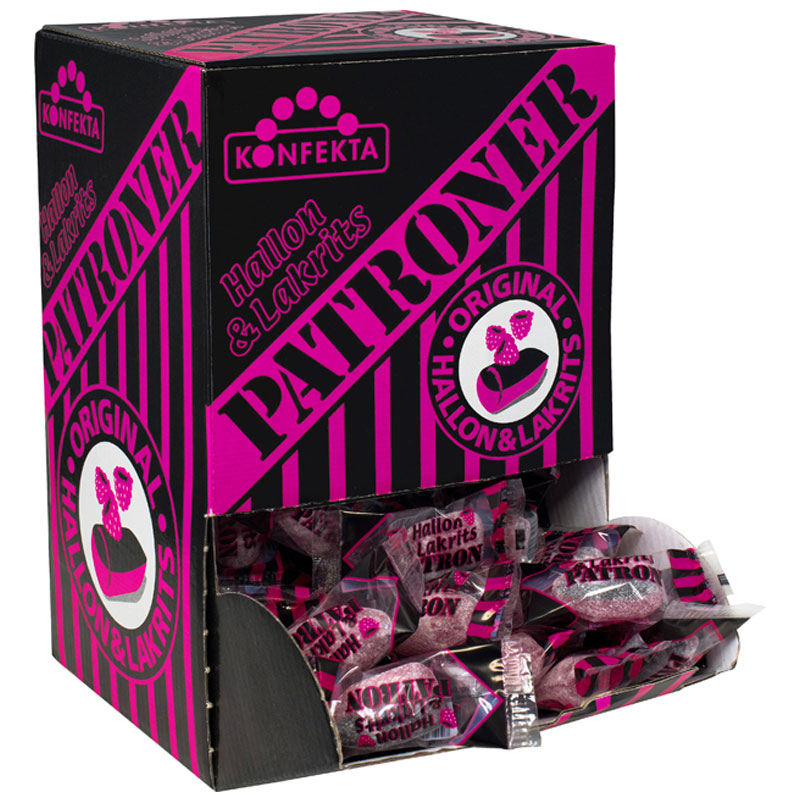 Hallon Lakrits Patroner består av en liten karamell med hallon lakrits smak.