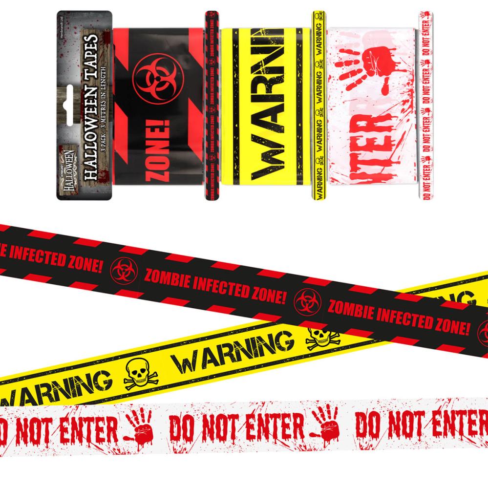 Halloween Avspärrningsband 3-pack innehåller tre avspärrningsband i svart med den röda texten "ZOMBIE INFECTED ZONE!" och en biohazardsymbol, i gult med den svarta texten "WARNING" och en dödskalle samt i vitt med den röda texten "DO NOT ENTER" och en blodig hand.