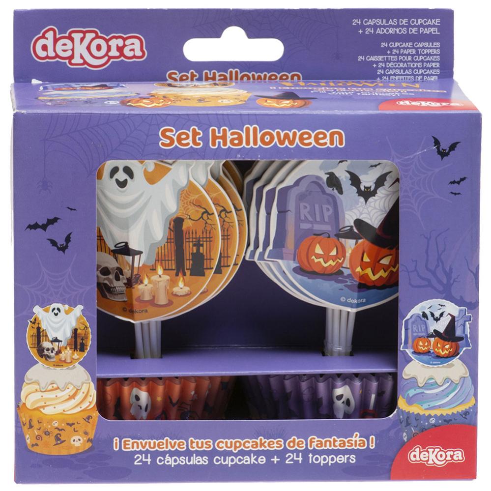 Halloween Cupcakes och Toppar Kit innehåller muffinsformar och toppers med halloween motiv. Kittet inkluderar 24 toppers med spöken och pumpor som motiv, tillsammans med 24 muffinsformar i orange och lila färger som är dekorerade med vita stjärnor, hattar, fladdermöss, spindlar, skallar, spöken, spindelnät och annat.