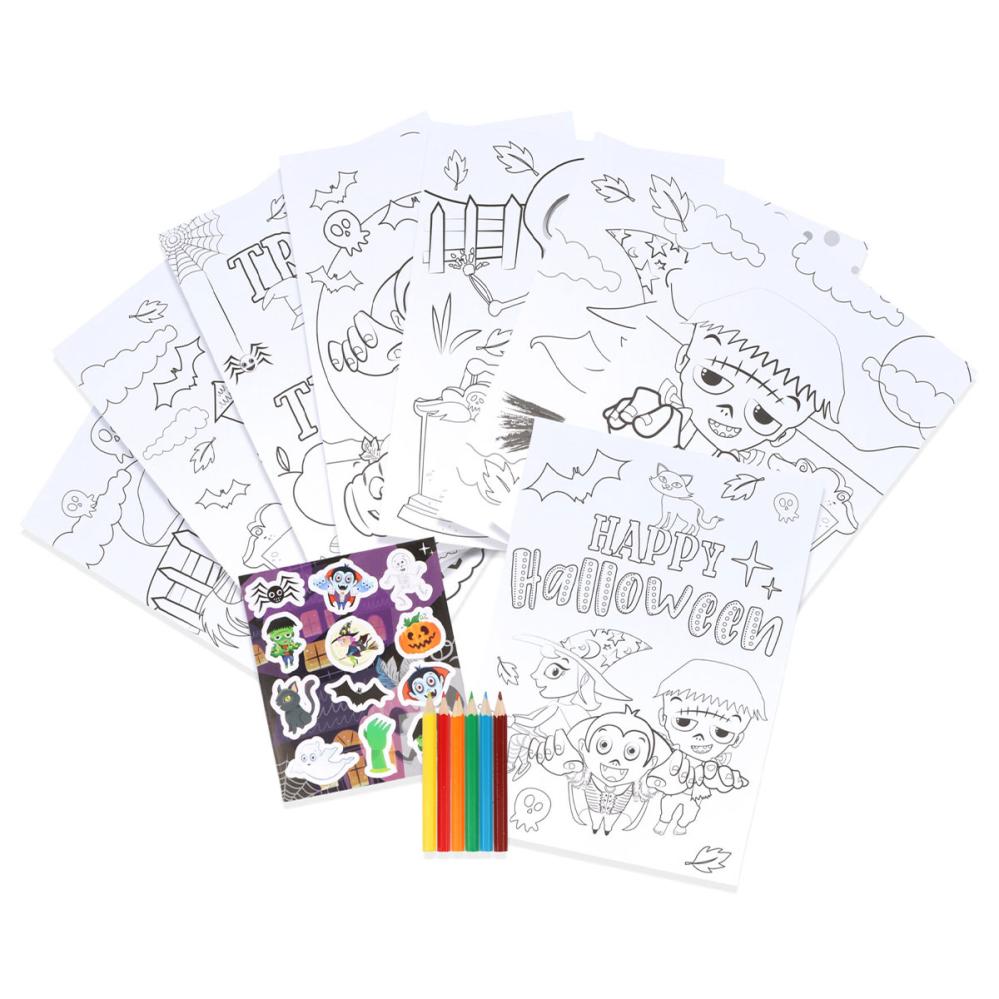 Halloween Färgläggningsset inkluderar åtta detaljerade A4-ark med halloweenmotiv och sex små färgpennor i färgerna grön, blå, gul, orange, brun och röd. Det medföljer även ett litet ark med tolv roliga och färgglada klistermärken som kan användas för att dekorera färdiga teckningar eller andra ytor.
