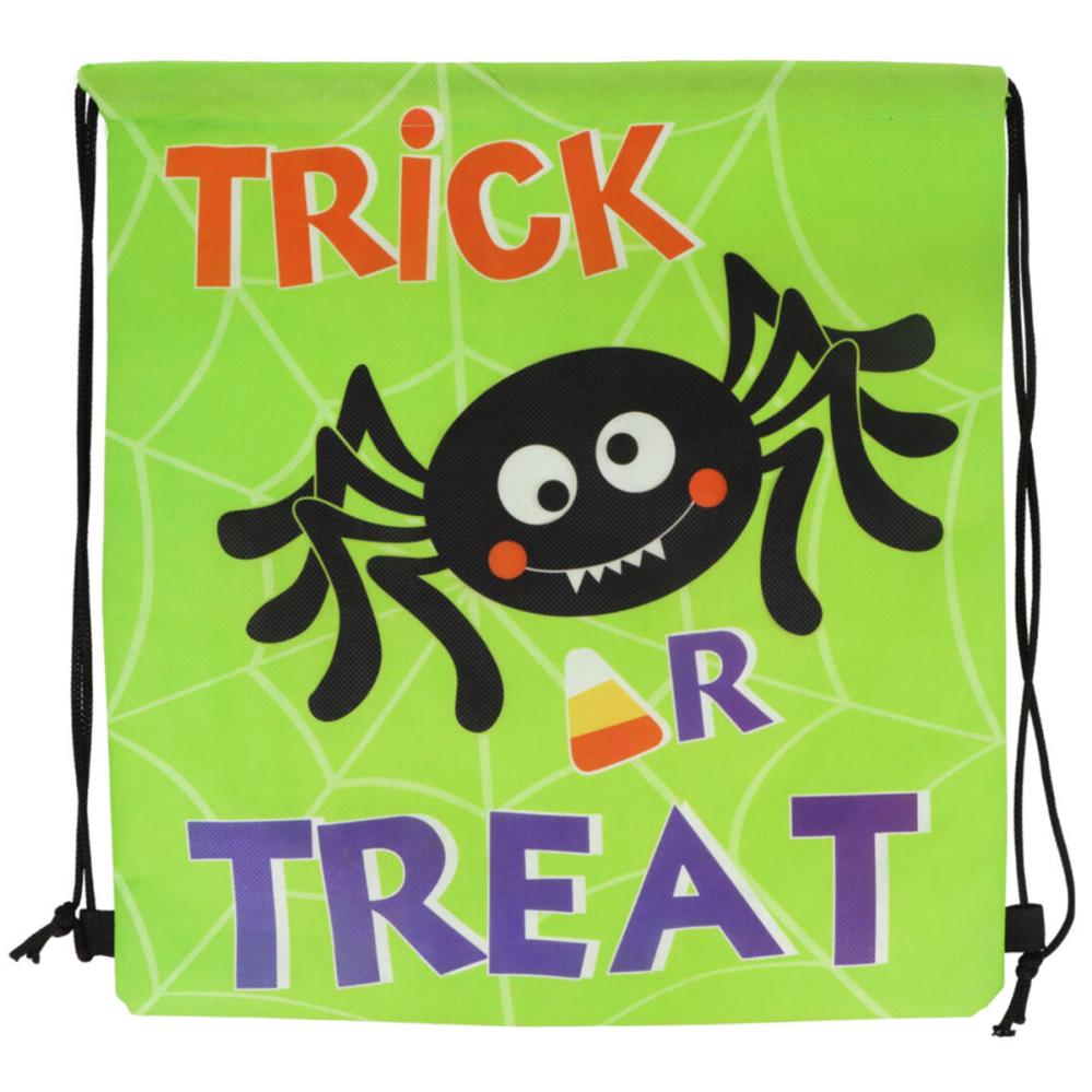 Halloween Gympapåse Trick or Treat omfattar en ljusgrön gympapåse som kan användas till både gympa och bus eller godis. Den har ett tryckt halloweenmotiv på ena sidan, föreställande ett spindelnät, en spindel och texten 'Trick or Treat'. Påsen stängs enkelt med dragsko och kan bäras som en ryggsäck.