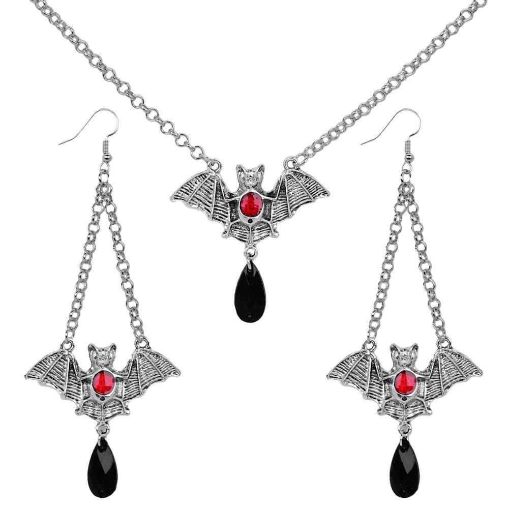 - Örhängen i form av fladdermöss i metall med röda detaljer.
