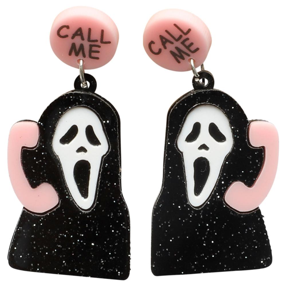 Halloween Örhängen Scream Call Me omfattar ett par roliga stiftörhängen föreställande Ghostface-spöket från Scream-filmerna, med en rosa telefon och en glittrande finish enbart på den svarta delen, samt texten 'Call me' på en separat hängande rund del.