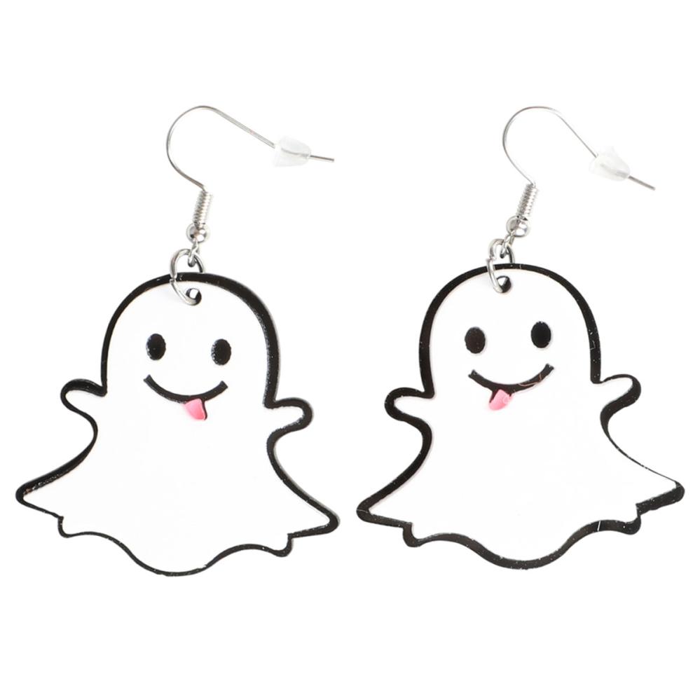 Halloween Örhängen Söta Spöken omfattar ett par krokörhängen föreställande leende vita spöken, kompletterade med utstickande tungor för en lekfull touch.