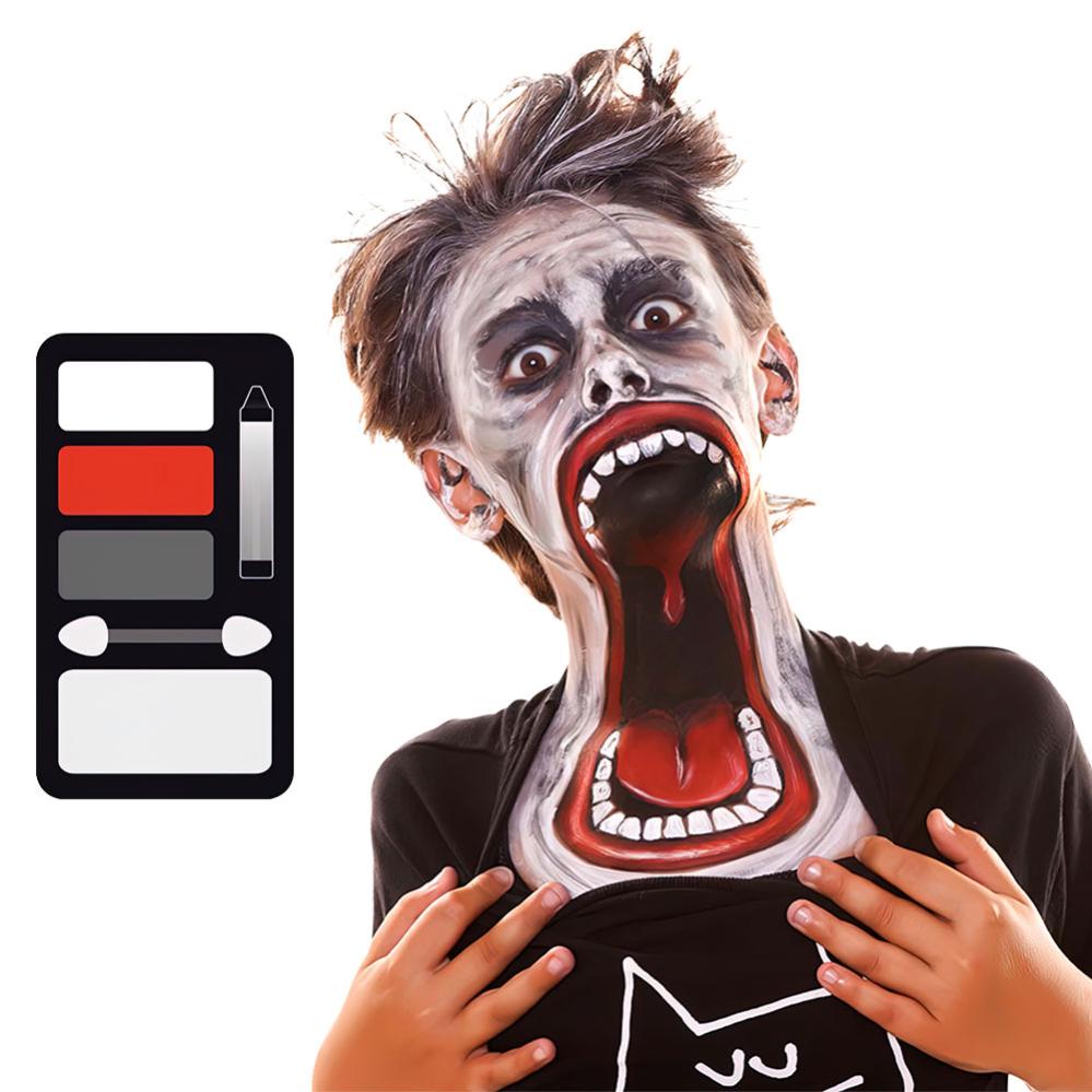 Vill du få till en riktigt snygg halloweensminkning inför skräckkalaset så är detta halloween smink kit för barn precis vad du behöver! I detta sminkset får du ansiktsfärger, en sminkpenna och de tillbehör du behöver för att skapa din halloween sminkning. Följ instruktionerna på förpackningen och se hur du förvandlas från en helt vanlig människa till ett läskigt monster med en enorm, öppen mun!