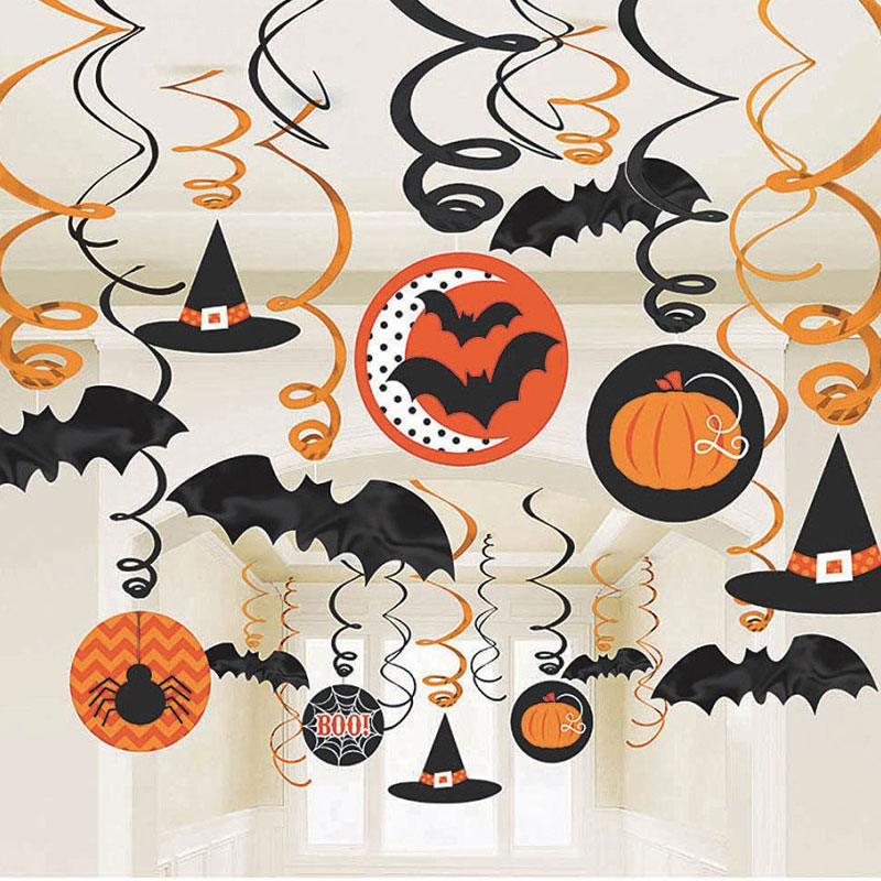 Halloween Swirls Dekorationer Spooky omfattar ett paket med 14 stycken swirls av glänsande material (svart och orange). Det medföljer även 16 stycken swirls med halloweenfigurer som består av fladdermöss, häxhattar, spindlar och pumpor. Dekorationerna hängs upp på lampan eller annan valfri plats med inkluderande öglor.