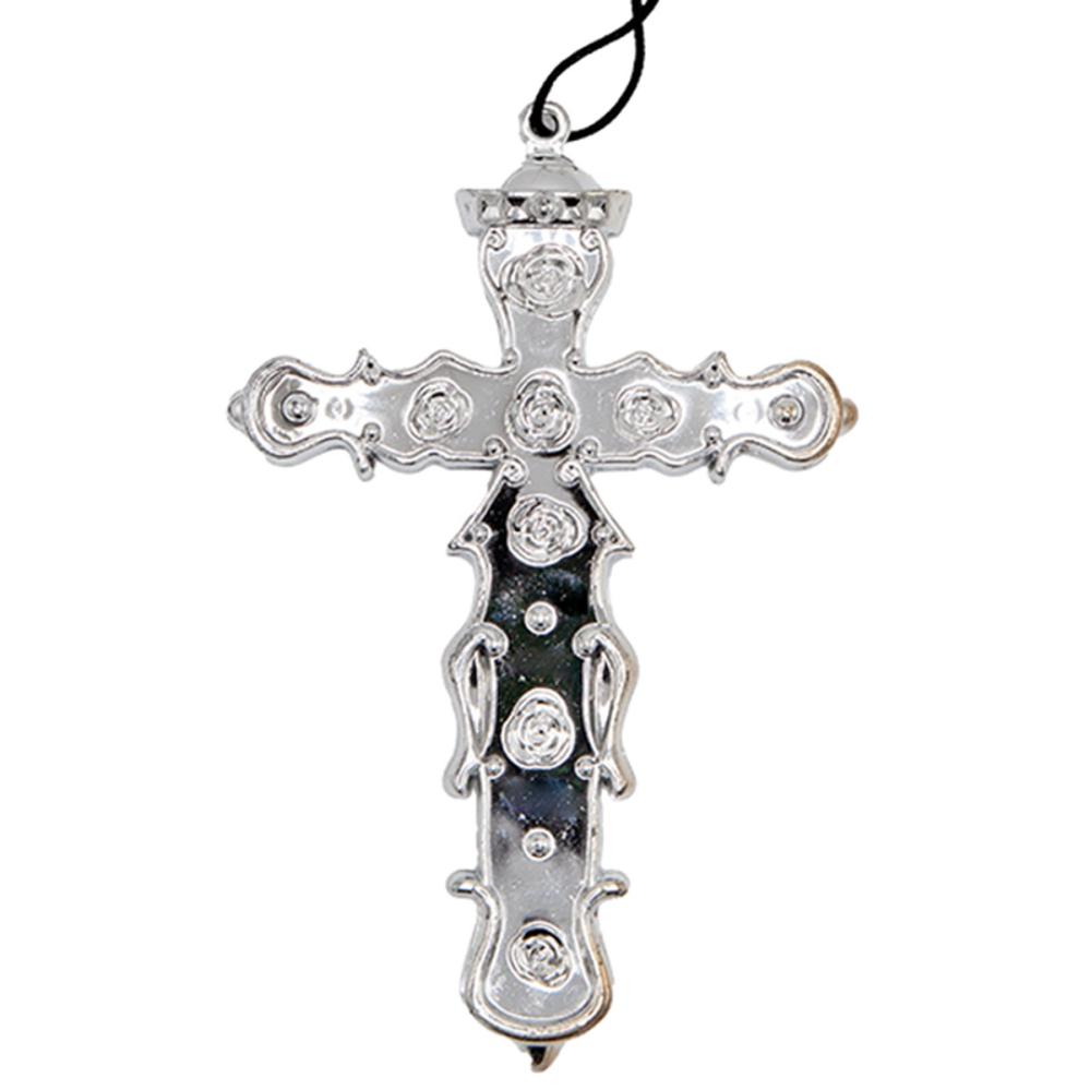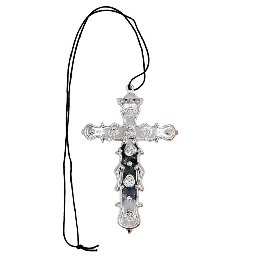 Halsband med Silvrigt Kors består av en svart kedja av polyester samt ett metalliskt silverfärgat kors dekorerat med blommor och juveler.