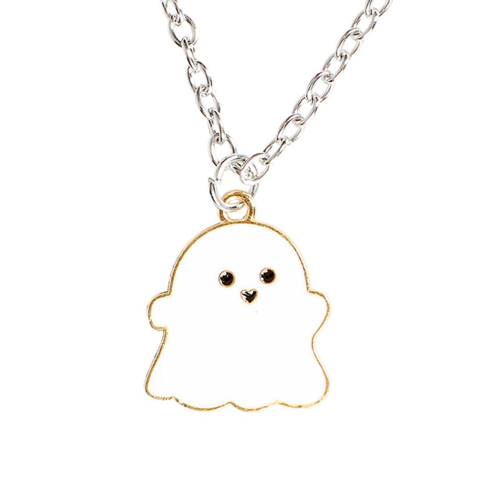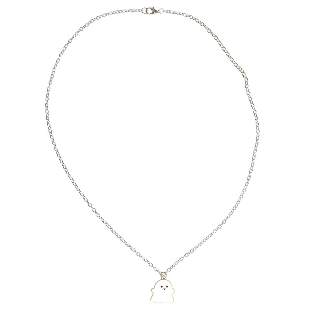 Som ett charmigt tillskott bland halloweensmycken kombinerar detta halsband ett tunt silvrigt kedjeband med ett lekfullt vitt spöke.